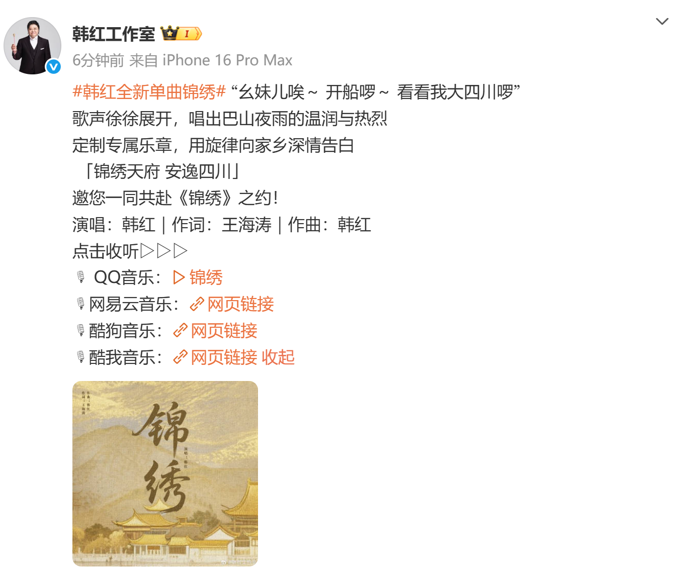 “幺妹儿唉,开船啰,看看我,大四川啰……”9月16日上午,伴随着高亢深情的歌喉,歌手韩红演唱的歌曲《锦绣》正式上线主流音乐平台,一展对锦绣天府的动情表白。
