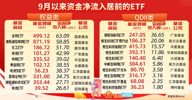 9月以来,A股市场高位震荡,虽然指数仍然创出新高,但振幅明显加大,投资者观望情绪有所上升。从ETF的规模及资金流向来看,在震荡行情中,资金仍然在借道ETF布局。数据显示,9月以来,权益类ETF合计吸引资金净流入近192亿元。细分行业类、主题类ETF受到资金青睐。化工ETF、券商ETF、电池ETF等资金净流入居前。
