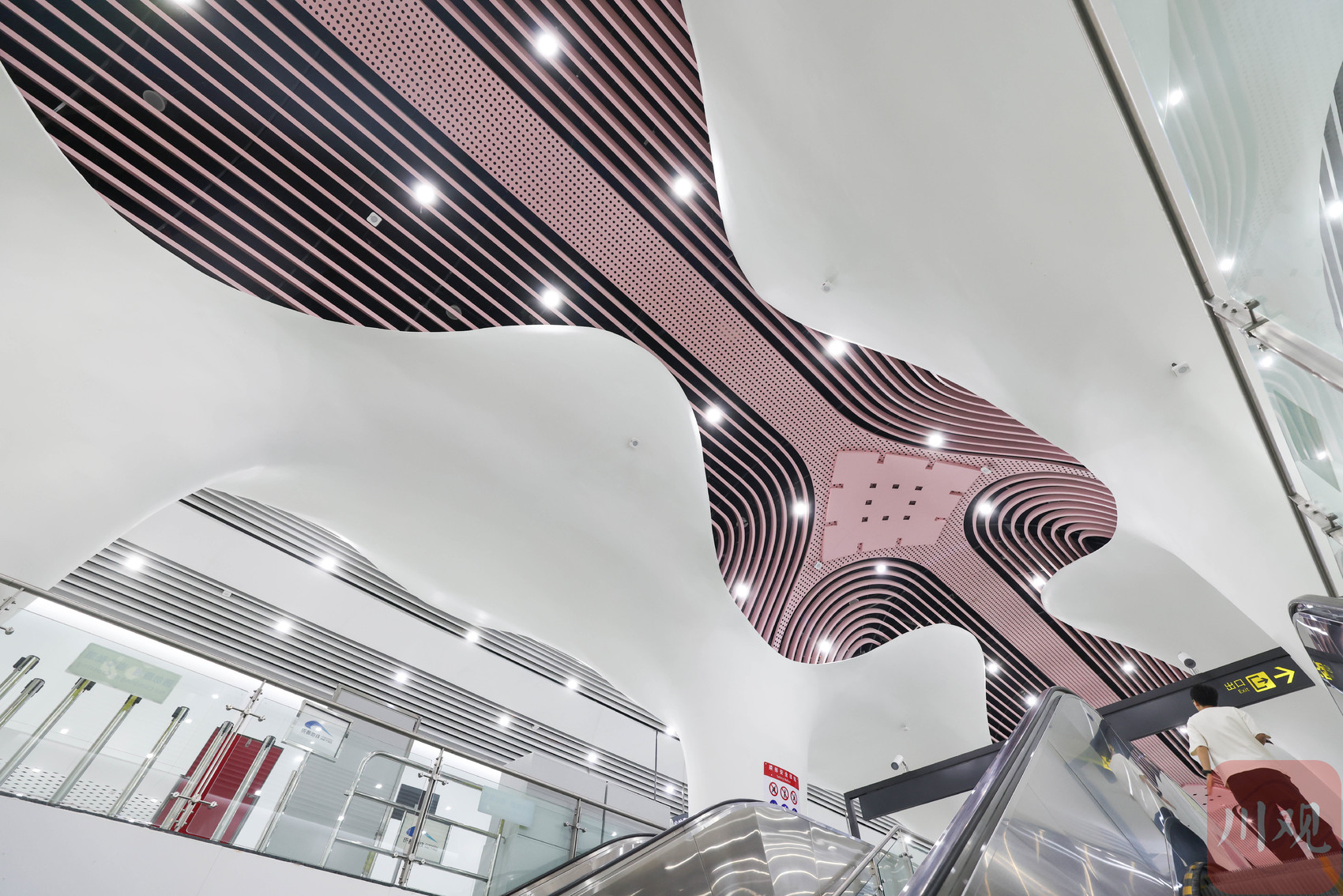 成都地铁10号线三期武侯祠站,大胆采用无柱折板拱中庭式特色站型,站厅层中部净高近10m,形成开阔的中庭空间,打造城市级艺术站标杆