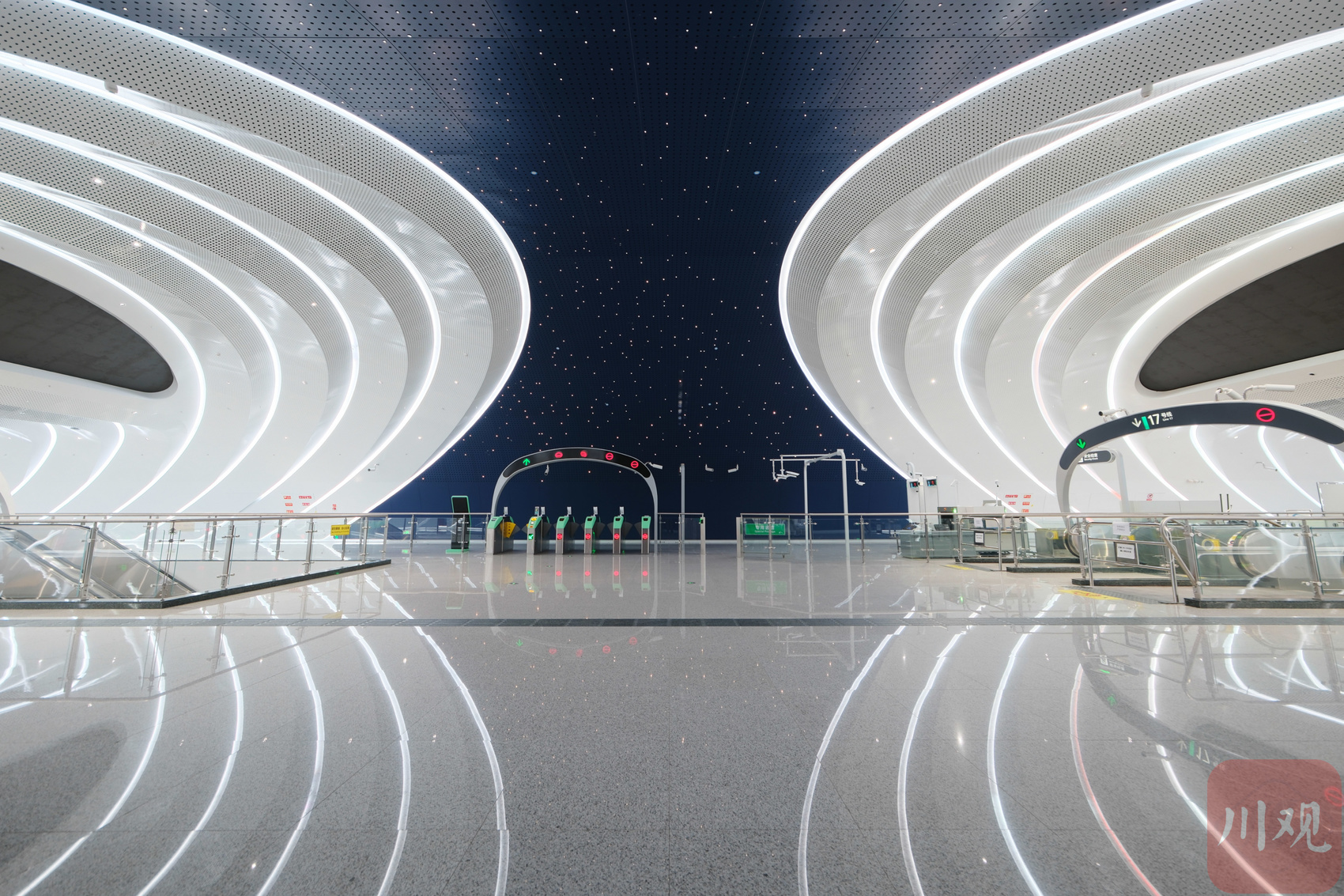 成都地铁17号线二期机车厂站以“成都的铁路历史”为主题,从高铁车头、铁轨、和隧道等事物中提取设计元素,创新的采用穹顶设计,集合LED灯具的布置,营造出满天繁星的视觉效果。成都轨道集团供图