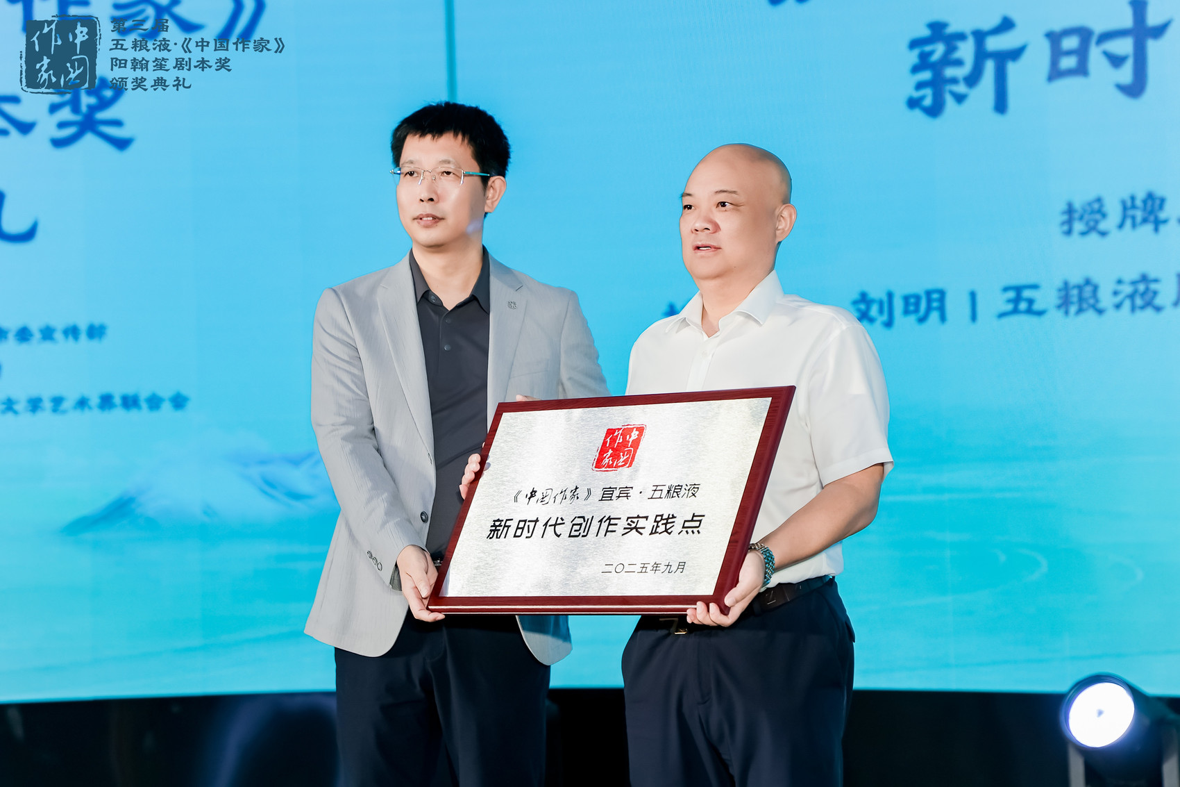 颁奖盛典上,刘明与柳建伟共同为仇秀莉颁发“最佳五粮液主题剧本奖”,现场掌声雷动。该剧本展现了中国酒文化的醇厚魅力,将酿酒工艺升华为文化自信,情醉人心。与此同时,现场还举行了“《中国作家》宜宾·五粮液新时代创作实践点”授牌仪式,《中国作家》杂志副主编梁飞向五粮液股份公司党委委员、监事会主席,中国酿酒大师刘明授牌。《中国作家》杂志社发言代表表示,文学的土壤需要不断耕耘与拓新。为进一步推动现实题材创作,扎根人民生活、书写时代篇章,强强联合的创新必不可少。这是中国白酒行业首次获颁此类文学创作实践点,标志着传统产业与国家级文学平台建立了更深合作,为传统产业与文学创作的跨界融合提供了新样本。