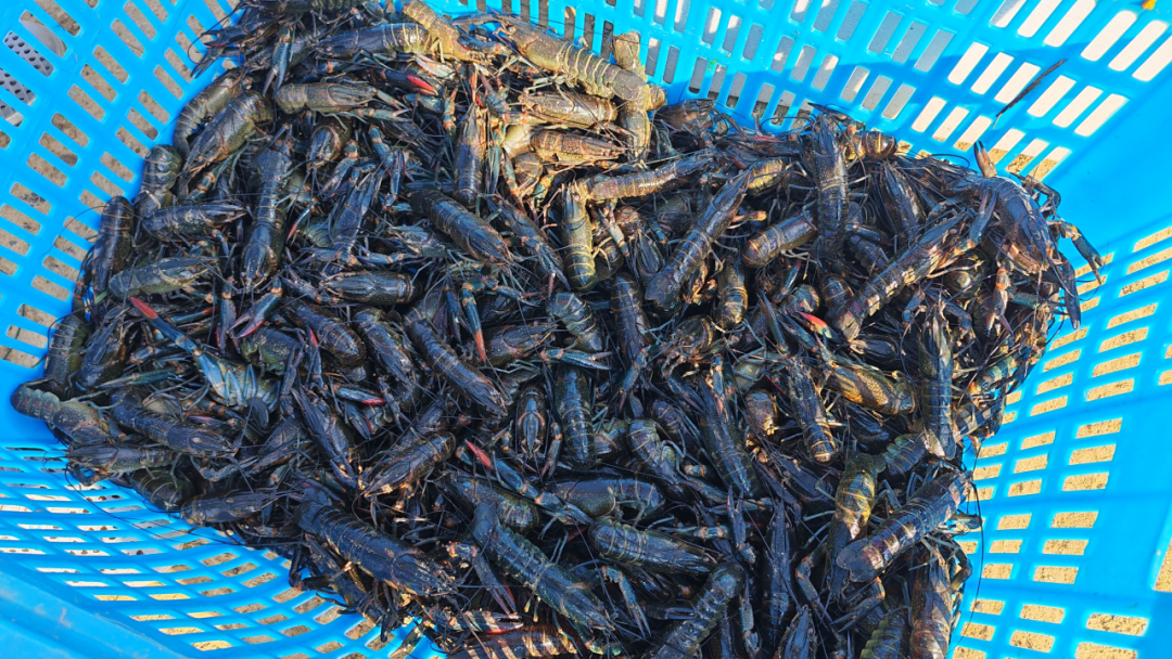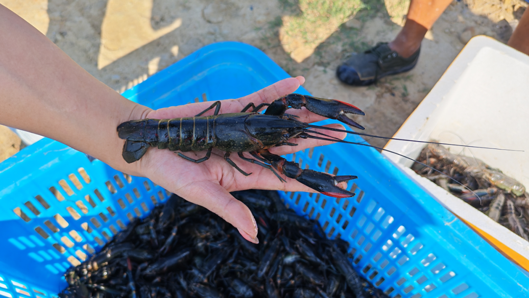 9月16日清晨,该基地早已是一派忙碌景象。工作人员拉网、起笼、装筐,动作娴熟流畅。一只只青壳白腹的澳洲淡水龙虾在筐中活蹦乱跳,偶尔有“越狱”企图的小龙虾,也迅速被“抓捕归案”。由于采取“稻虾共生”生态循环模式,龙虾生长环境洁净,出水后几乎不沾泥污,无需清洗即可分拣发货。