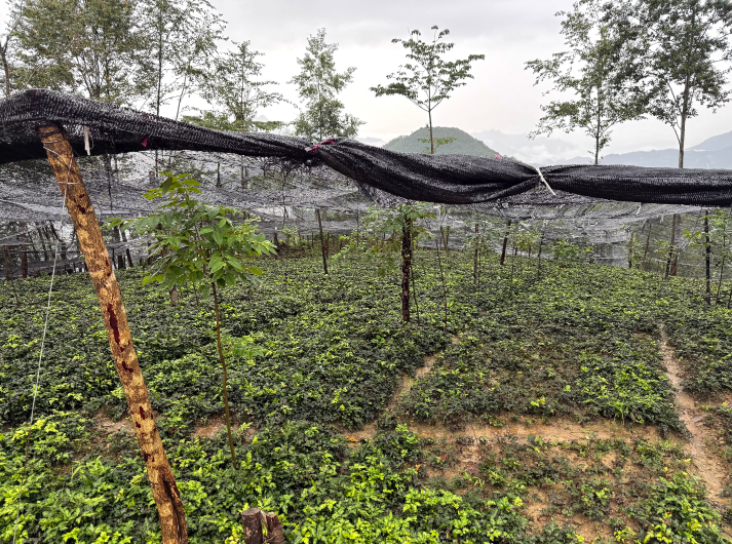 9月16日上午,广元市青川县房石镇,高大的黄柏树下,一簇簇黄连苗在露水下显得格外翠绿。