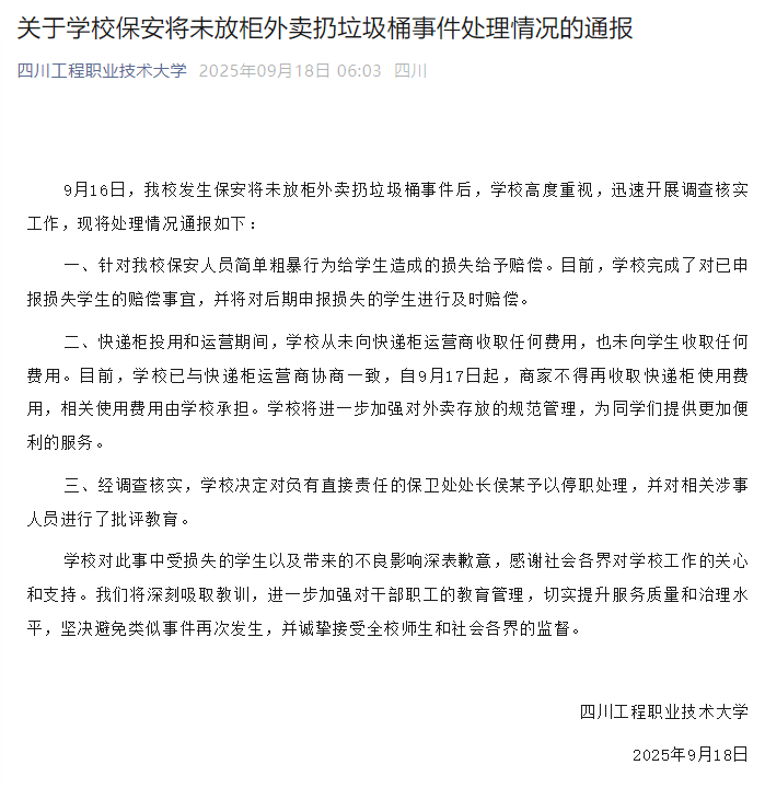 9月18日清晨6点过,四川工程职业技术大学就学校保安将未放柜外卖扔垃圾桶事件处理情况进行通报。学校对保安人员简单粗暴行为给学生造成的损失给予赔偿,对负有直接责任的保卫处处长侯某予以停职处理。