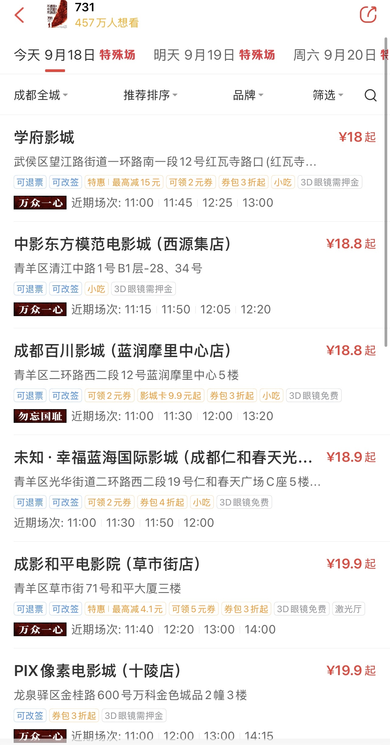 根据猫眼平台显示,除了“警钟长鸣”特殊场次外,各地影院还创新设置了“铭记历史”“勿忘国耻”“万众一心”等多个主题场次。记者从成都多家影院了解到,尽管影片技术上可在9点开始放映,但特意选择9点18分这个时间点,是为了让观众在特定时刻感受历史的沉重。