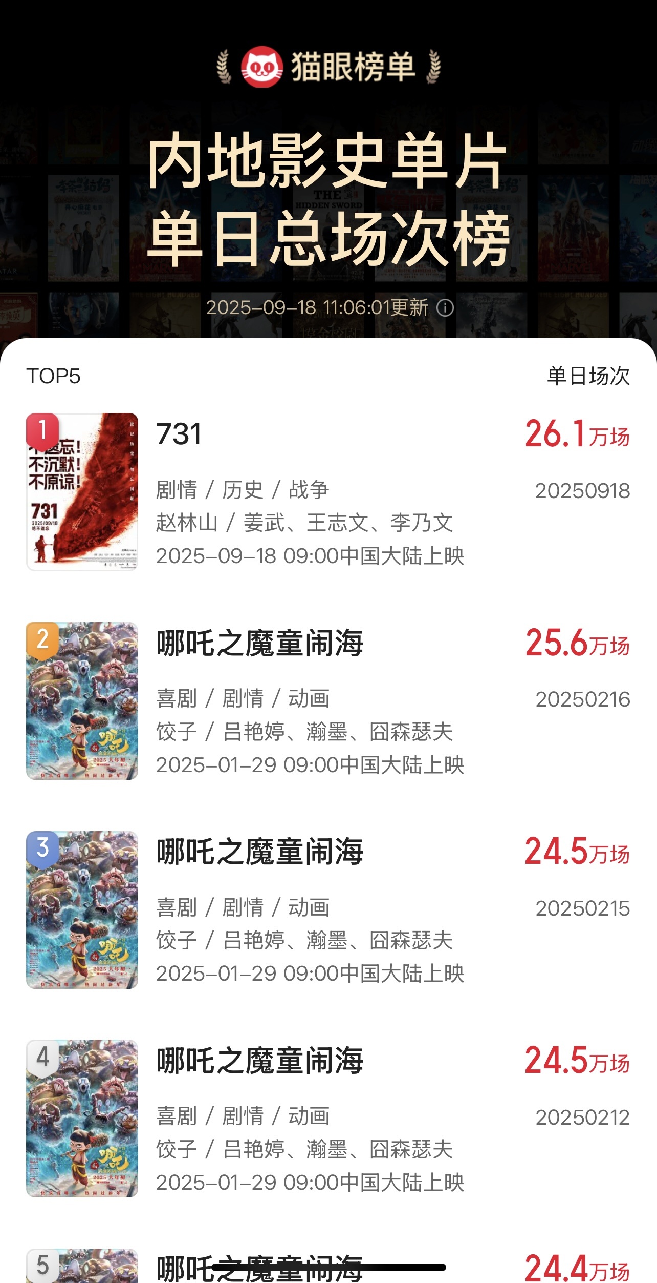 #731影史单片单日总场次冠军