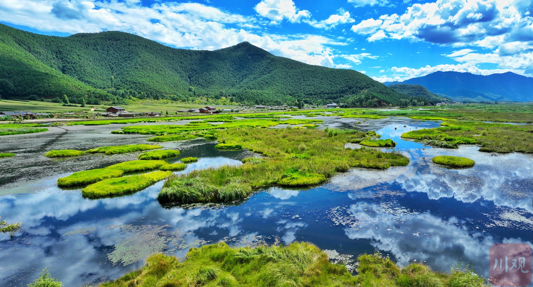 倒影湖中的蓝天白云与走婚桥相伴。