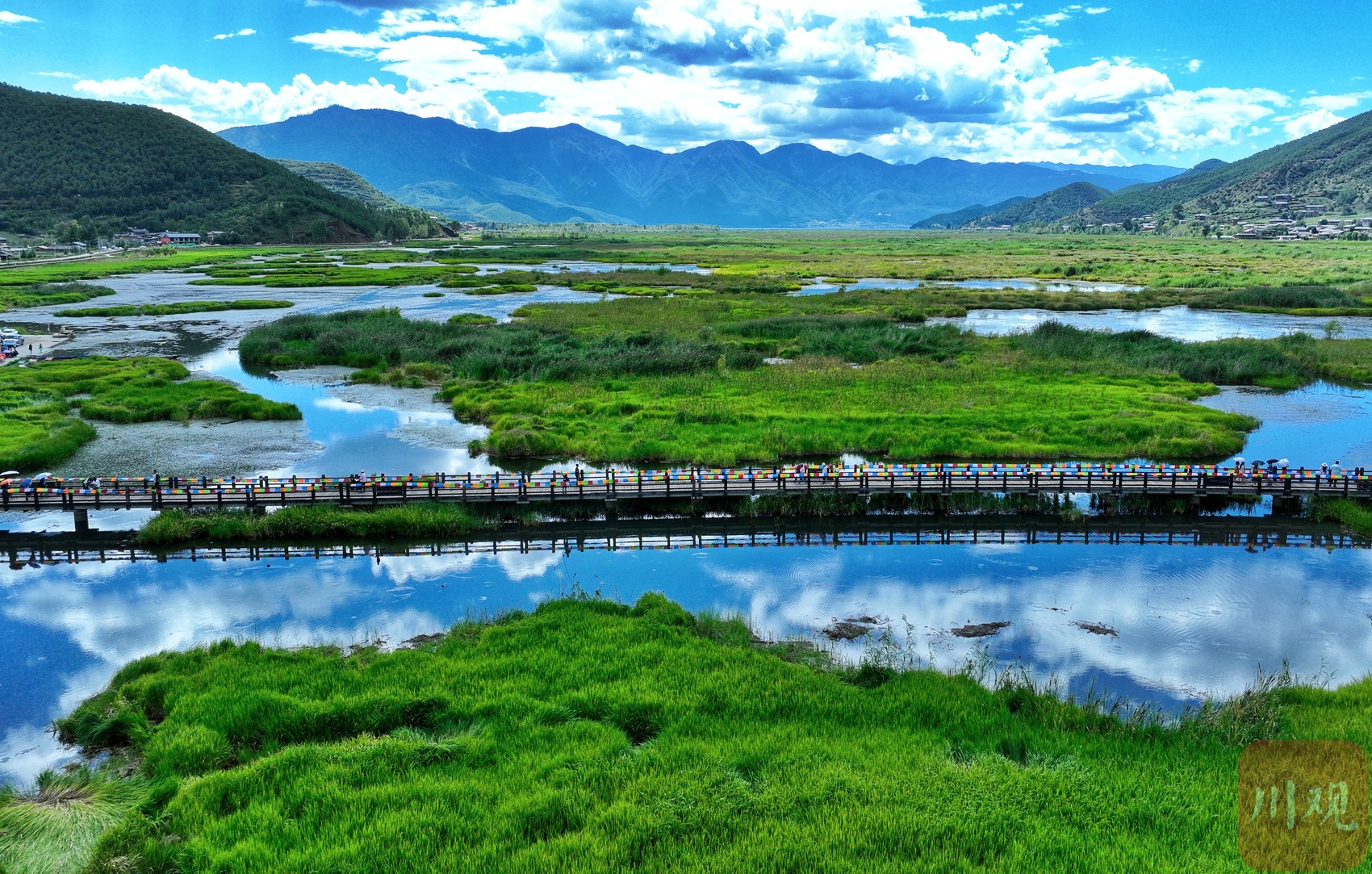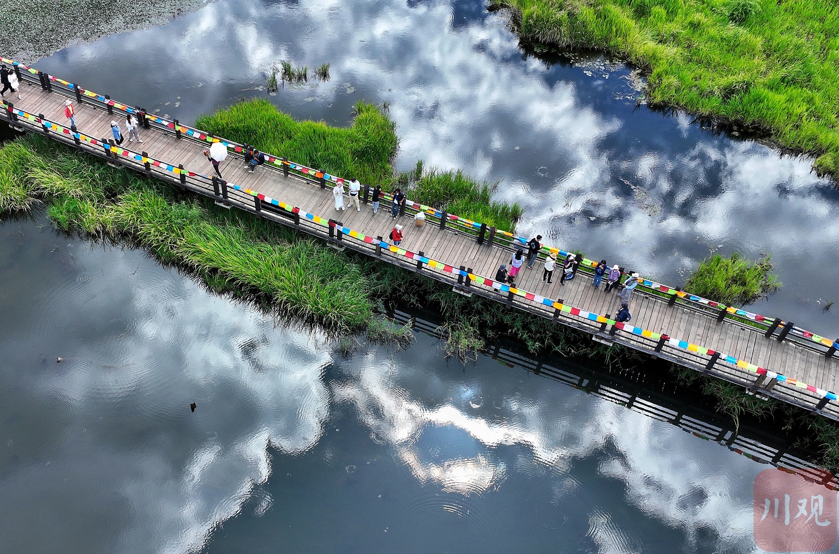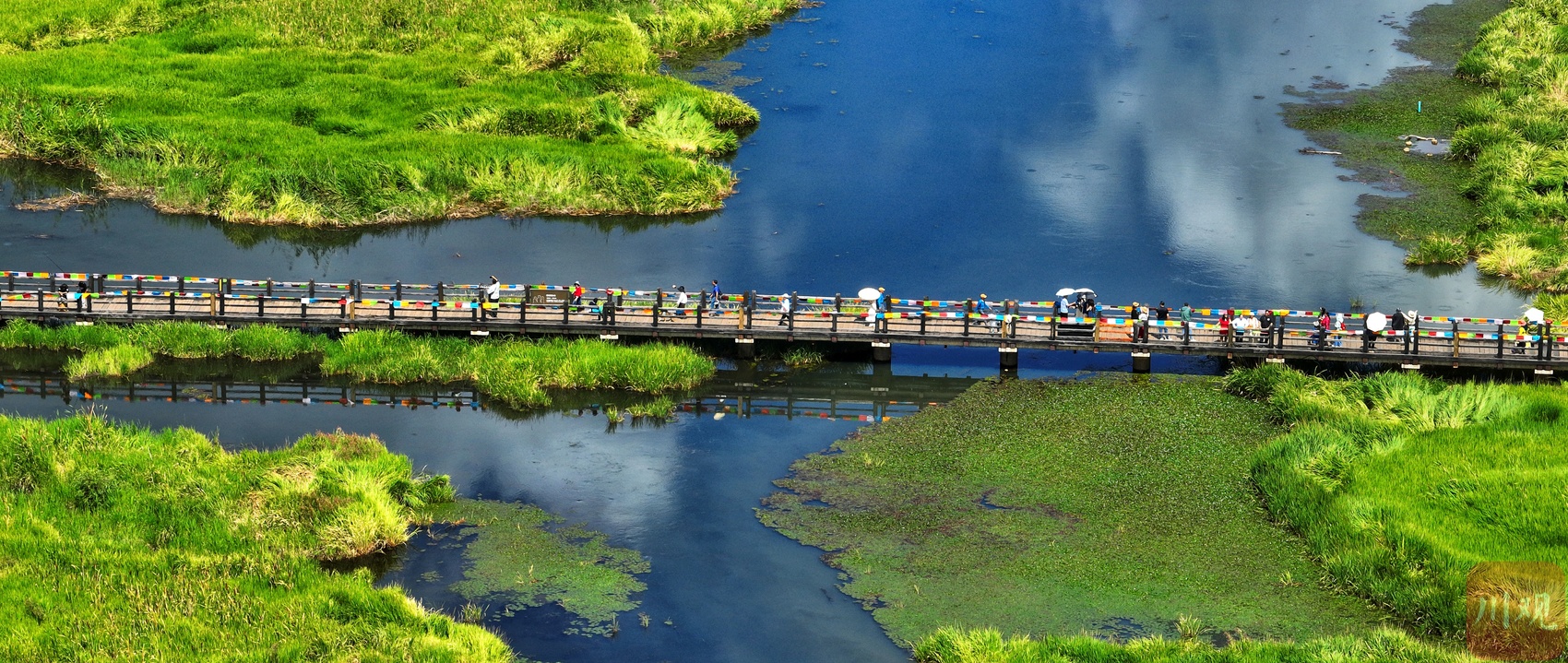 走在桥上,脚下的翠绿色草海正悄然随秋意变换——夏日常见的浓绿慢慢褪去,转而染上浅绿,间或点缀几缕微黄。灰褐色的木桥蜿蜒穿梭于湿地间,桥身与水中浮动的白云倒影交叠,勾勒出静谧又诗意的景致。游客们或漫步赏景,或驻足拍照,在水天一色的自然意境里,静静感受摩梭文化的独特韵味。
