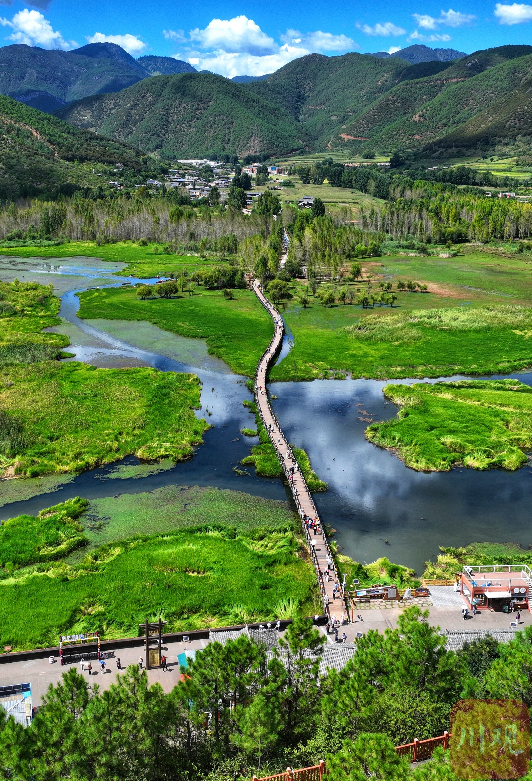 这样高空拍摄出来好漂亮啊!我们上个月去泸沽湖走婚桥去走了一遍,也许是天气原因,觉得很普通,远没有这么震撼,印象深刻的是桥两边的湿地里有大娘现编花环在卖!喜欢!