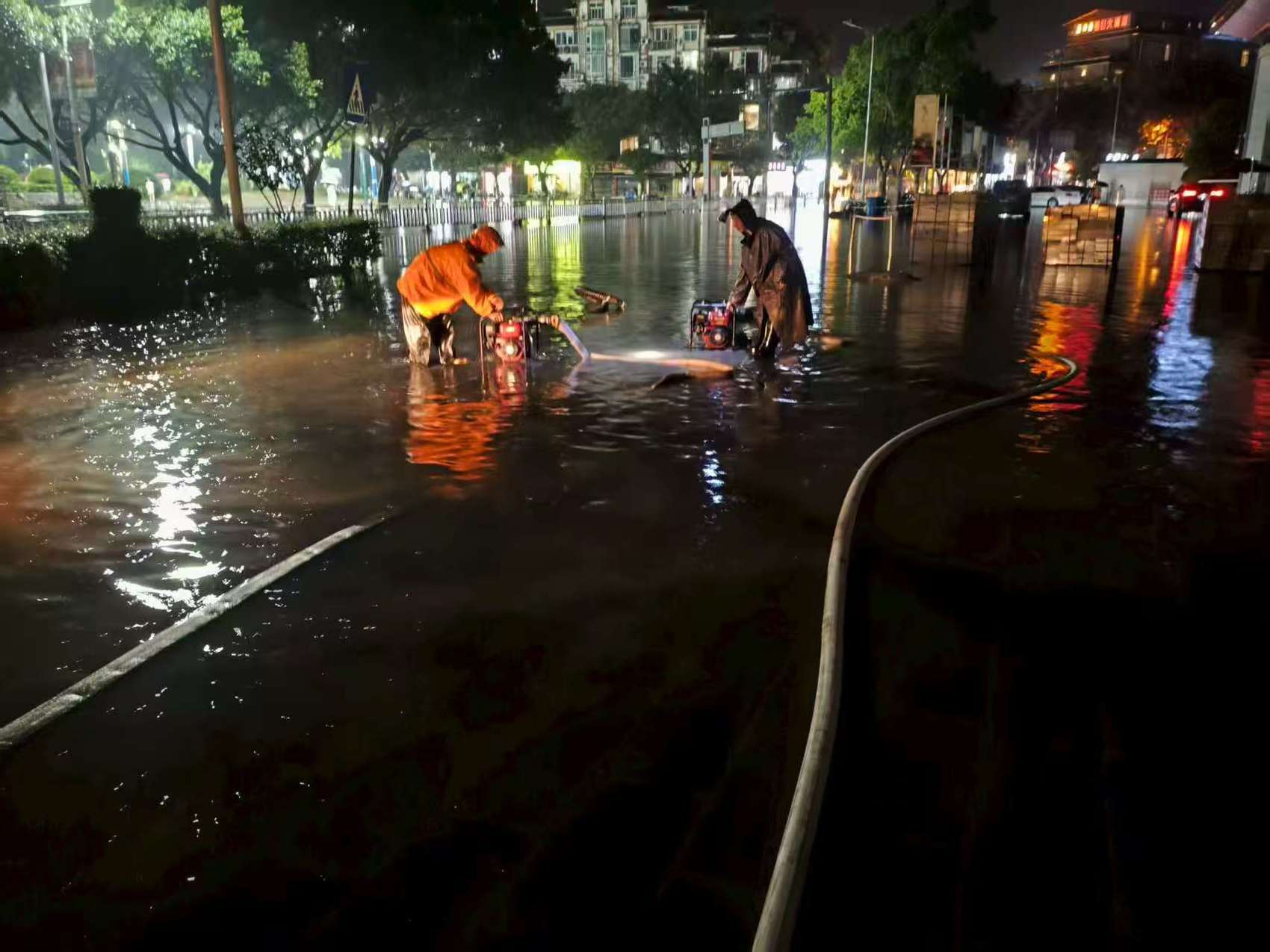 9月17日晚,宜宾市长宁县工作人员用抽水设备排除街面淤积的水。宋成均 摄