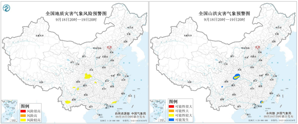 → 水利部和中国气象局联合发布橙色山洪灾害气象预警,提示9月18日20时至19日20时,四川东部、重庆北部等地发生山洪灾害可能性较大(黄色预警),其中,四川东部局部地区发生山洪灾害可能性大(橙色预警)。其他地区也可能因局地短历时强降水引发山洪灾害,请各地注意做好实时监测、防汛预警和转移避险等防范工作。