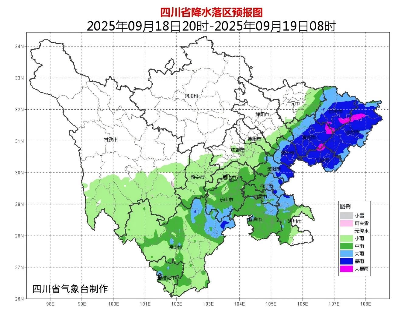 今天晚上,达州、广安、巴中、南充、遂宁5市,资阳、内江、自贡3市东部,宜宾、泸州2市北部,乐山市南部有大雨到暴雨,局地大暴雨;攀西地区部分地方有中到大雨,个别暴雨。