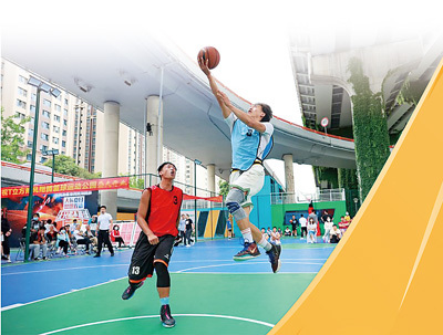 居民在改造后的成都双桥子立交桥下篮球公园运动。刘雨杰 摄