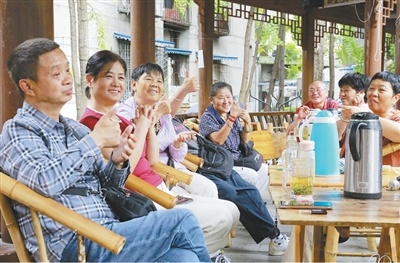 居民在改造后的杏园饮茶聊天。王钦玉 摄