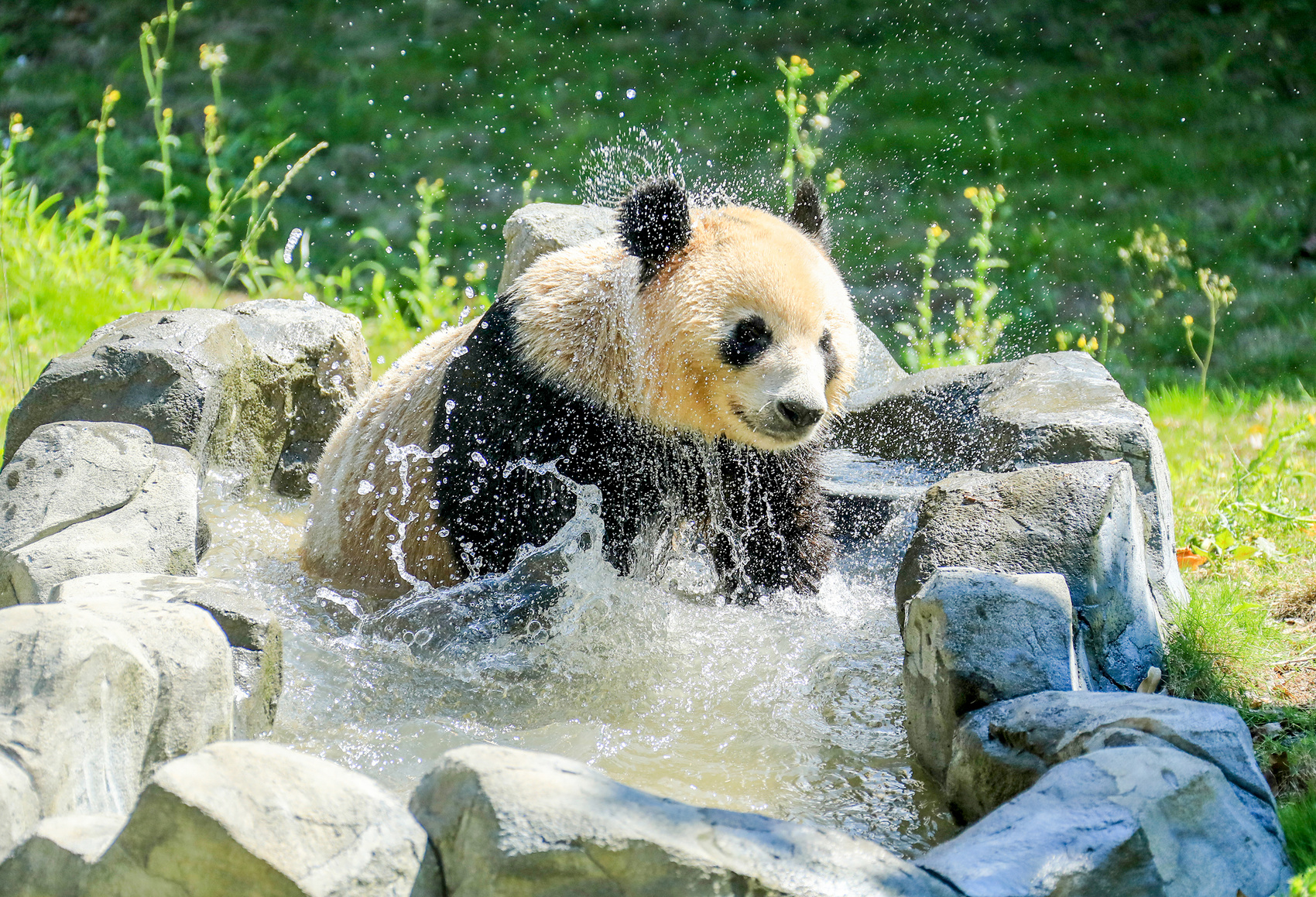 华蓥山大熊猫苑的大熊猫在戏水。(邱海鹰 摄)