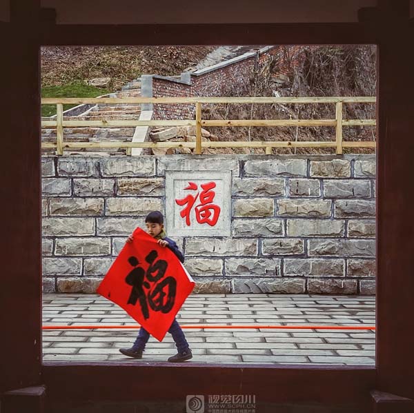 1月24日,德阳市罗江县,一个小男孩手拿福字从大门走过。2017年春节即将到来。