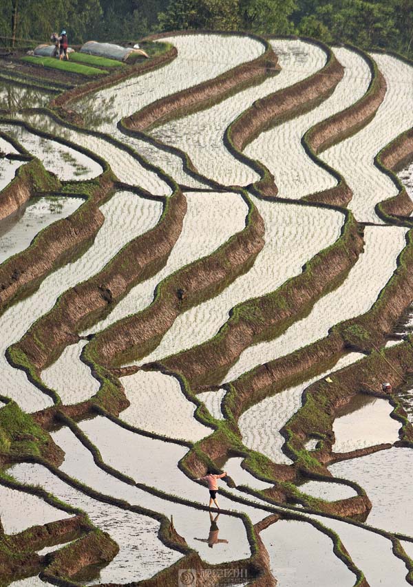 4月20日,“谷雨”,乐山市沙湾区葫芦镇四峨山,村民在田埂上忙碌。