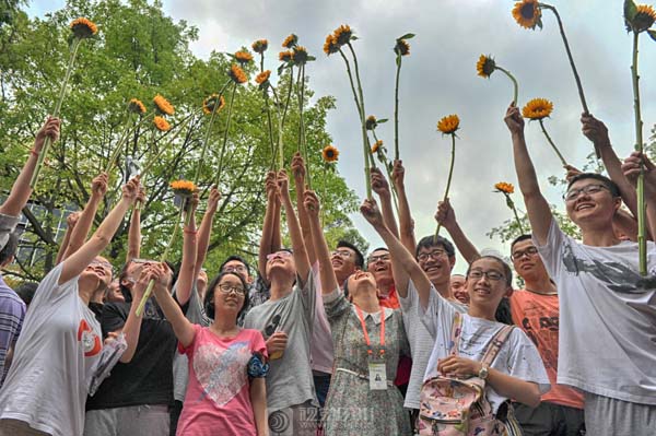 6月8日,2017年普通高考结束,成都7中考点外家长们给考生准备了向日葵,寓意夺魁。