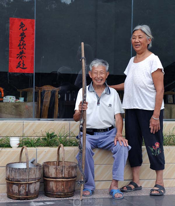 8月10日,泸州市上马镇黄桷坝村78岁的刘淑钦夫妇从15年前开始免费为过往的乡亲提供茶水从未间断。