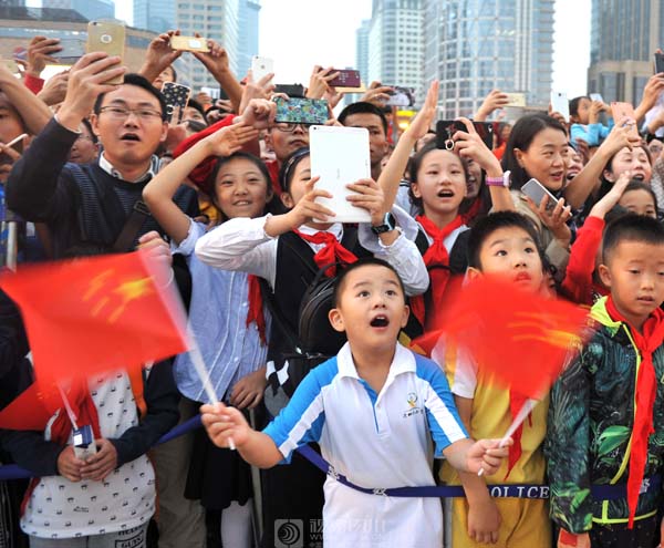10月1日,观看天府广场升旗仪式的小朋友挥舞国旗,当日中华人民共和国迎来68岁华诞。