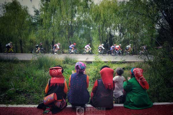 10月15日,凉山州泸沽湖景区,当地群众观看环湖自行车比赛。