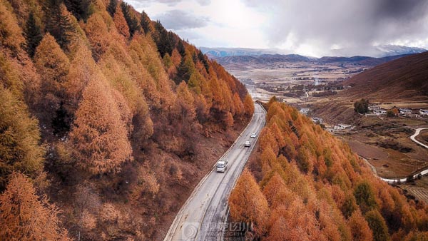 11月5日,甘孜州道孚县国道350线上落叶松形成高原冬景。