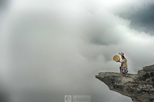 11月17日,汶川县龙溪乡的释比朱金龙老人登上枯乡周达村的鹰头石上进行传统祈福仪式。第二天将迎来羌历新年。