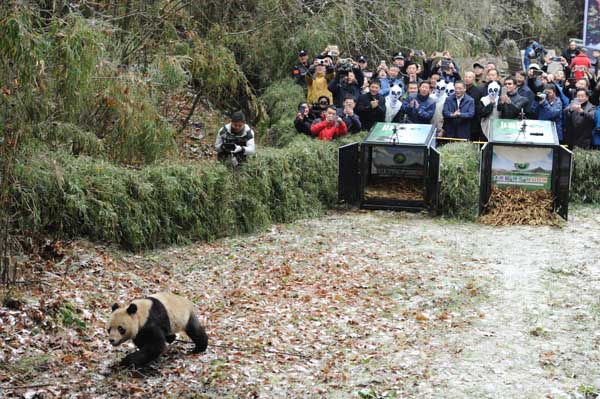 11月23日上午,大熊猫“八喜”、“映雪”在四川雅安栗子坪国家级自然保护区成功放归。这是全球第二次同时放归两只大熊猫,也是全球首次同时放归两只异性大熊猫。