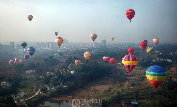 11月25日,参加2017中国长宁蜀南竹海全国热气球锦标赛的50只五彩斑斓的热气球升空,美如童话。
