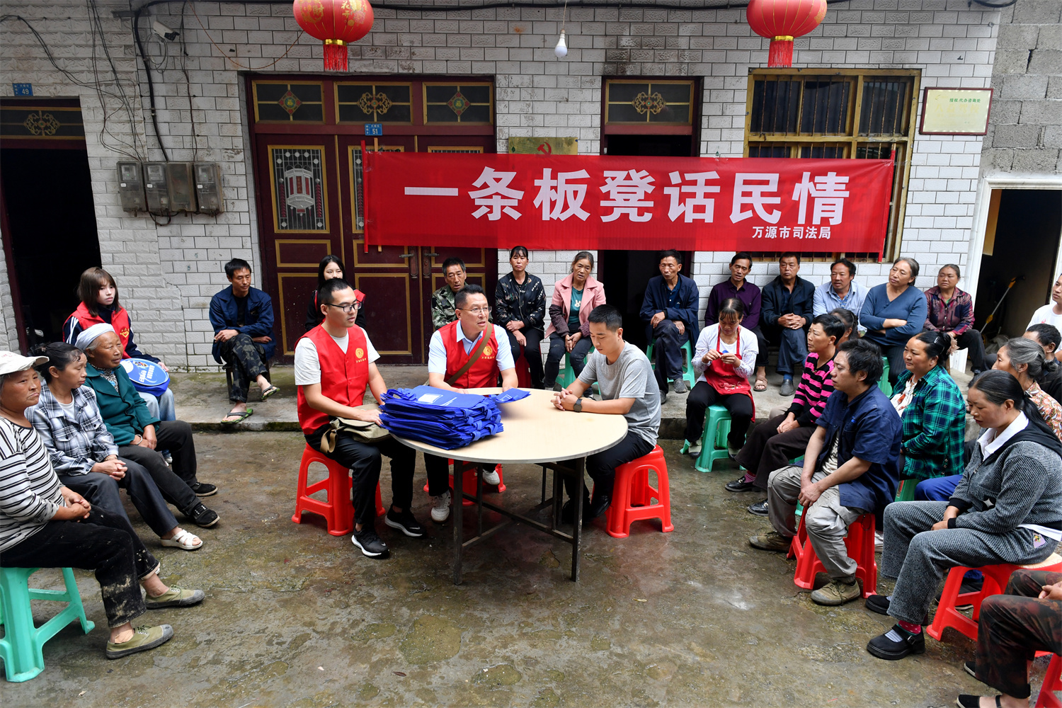 9月11日,秋雨过后的大巴山脉云雾缭绕,在万源市蜂桶乡新房子村的一个院落里,万源市司法局举行了一场“一条板凳话民情”的活动。来自万源市司法局挎包普法服务队的队员们,向村民们进行着法治宣传,听取大家的法律问题诉求,现场提供法律咨询服务。