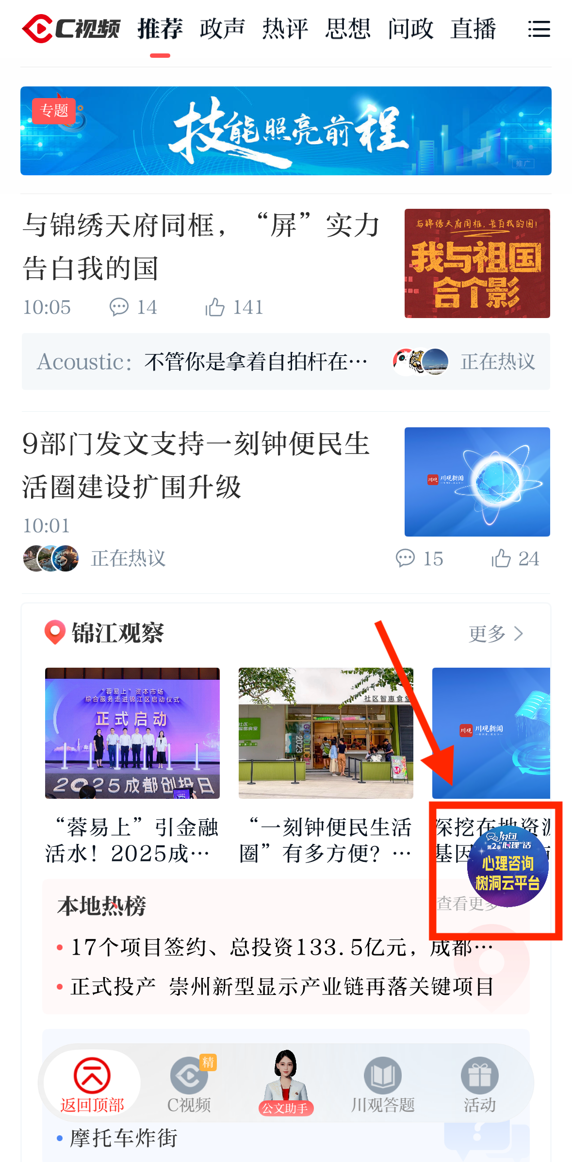 第二步,在川观新闻首页,点击右下方悬浮球,找到“四川省学生心理咨询树洞云平台”图片,点击即可参与;