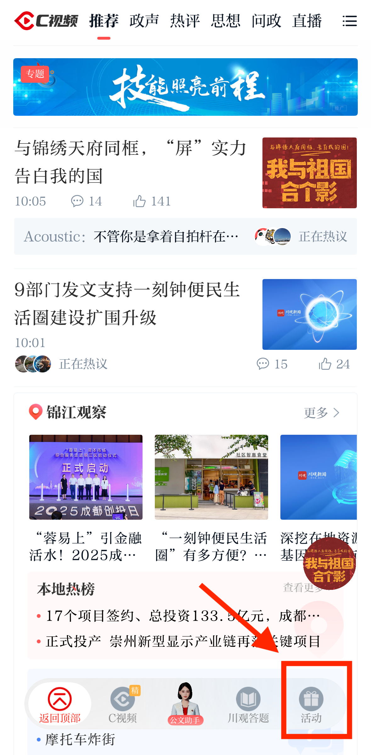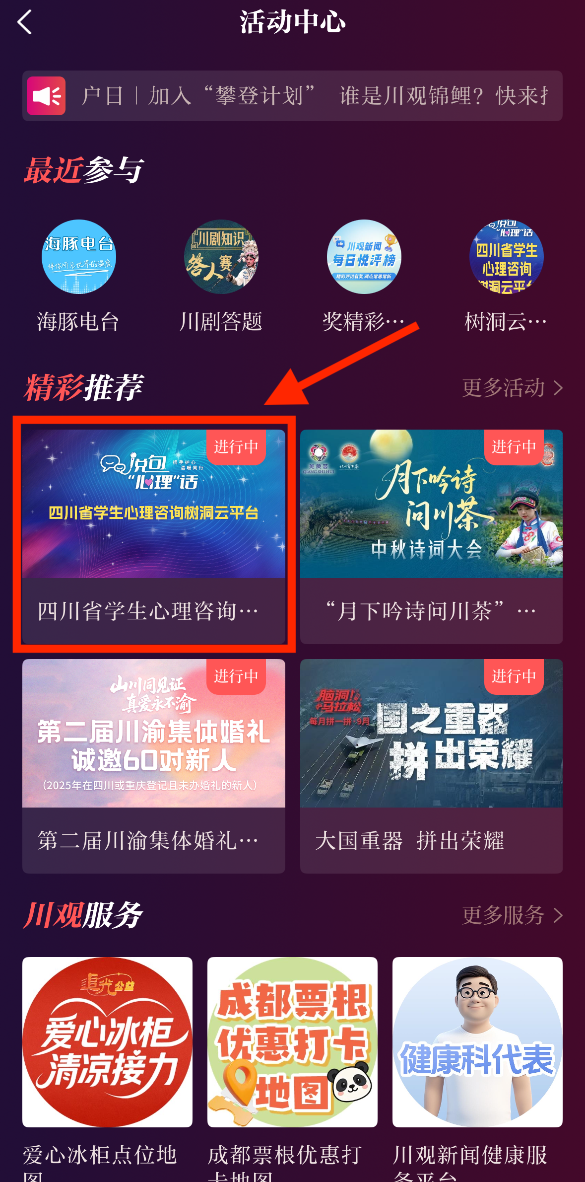 或者在川观新闻首页,点击右下角“活动”,点击“活动中心”,找到“四川省学生心理咨询树洞云平台”图片,点击即可参与。
