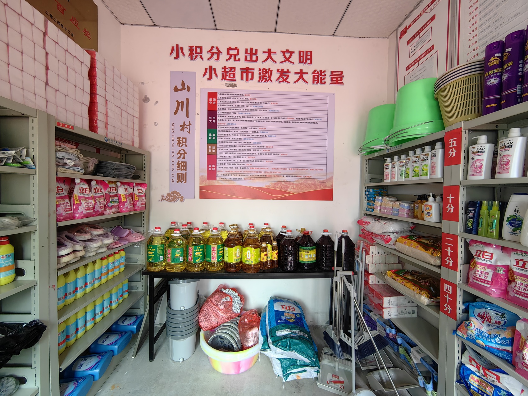 “积分有啥用?”面对提问,村党支部书记陈波笑着答道:“可以当钱花。”他带我们走进村委会院内的“积分超市”——这里没有售货员,货架上整齐摆放着粮油、调味品、日常用品等商品,村民只需扫码,就可用积分自由兑换。“1积分相当于1元钱。”