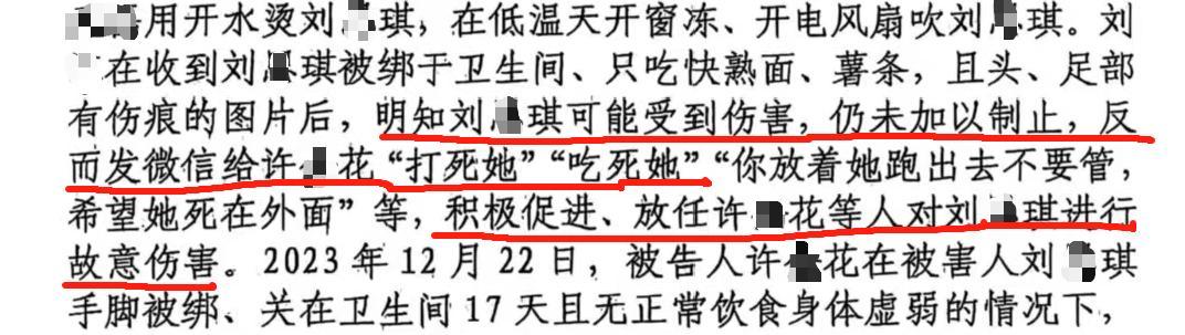 一审判决书还原了该案部分细节。2020年以来,许某某对琪琪实施殴打辱骂、捆绑挨饿、用开水烫等多种虐待行为,其间,刘某明知许某某的虐待行为而放任不管,甚至帮助其网购1600片泻药给琪琪服用。2023年12月5日起,琪琪被许某某关在卫生间长达17天,这期间遭受持续虐待,包括被喂食大剂量泻药及掺了尿液的雪碧,按头撞墙、伤口泡脏水、在低温天开窗冻和开电风扇吹等行为。面对许某某发来的琪琪被捆受伤照片,刘某仍未加以制止,并回复“这个星期五下午,把她捆起来,去买个长绳子,把她全身捆上,然后放在地上,你们全部过来,再不给她吃饭,手脚都用胶带捆起来,就给她饿两天……”“捆得死死的,让她解也解不了,怎么都不管她,我让她放在地上两天试一下……”等消息,积极促进、放任许某某的虐待行为。更令人发指的是,在许某某抱怨琪琪闯祸丢脸后,刘某竟回复要狠狠地打,并随即回家持棍殴打被捆绑住的琪琪,致孩子手部、腿部多处瘀青、额头流血。
