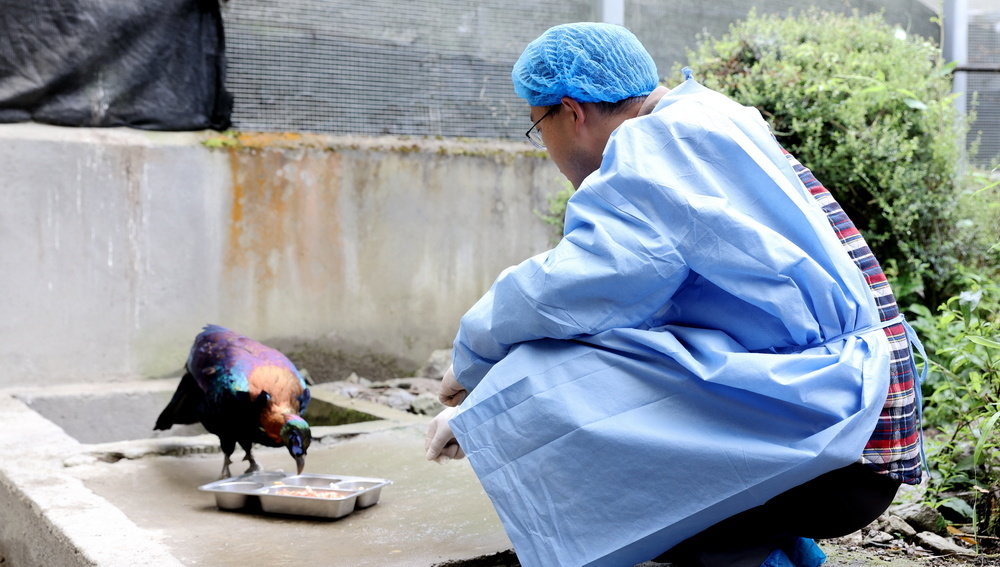 四川宝兴绿尾虹雉保护研究中心工作人员为绿尾虹雉精心备食