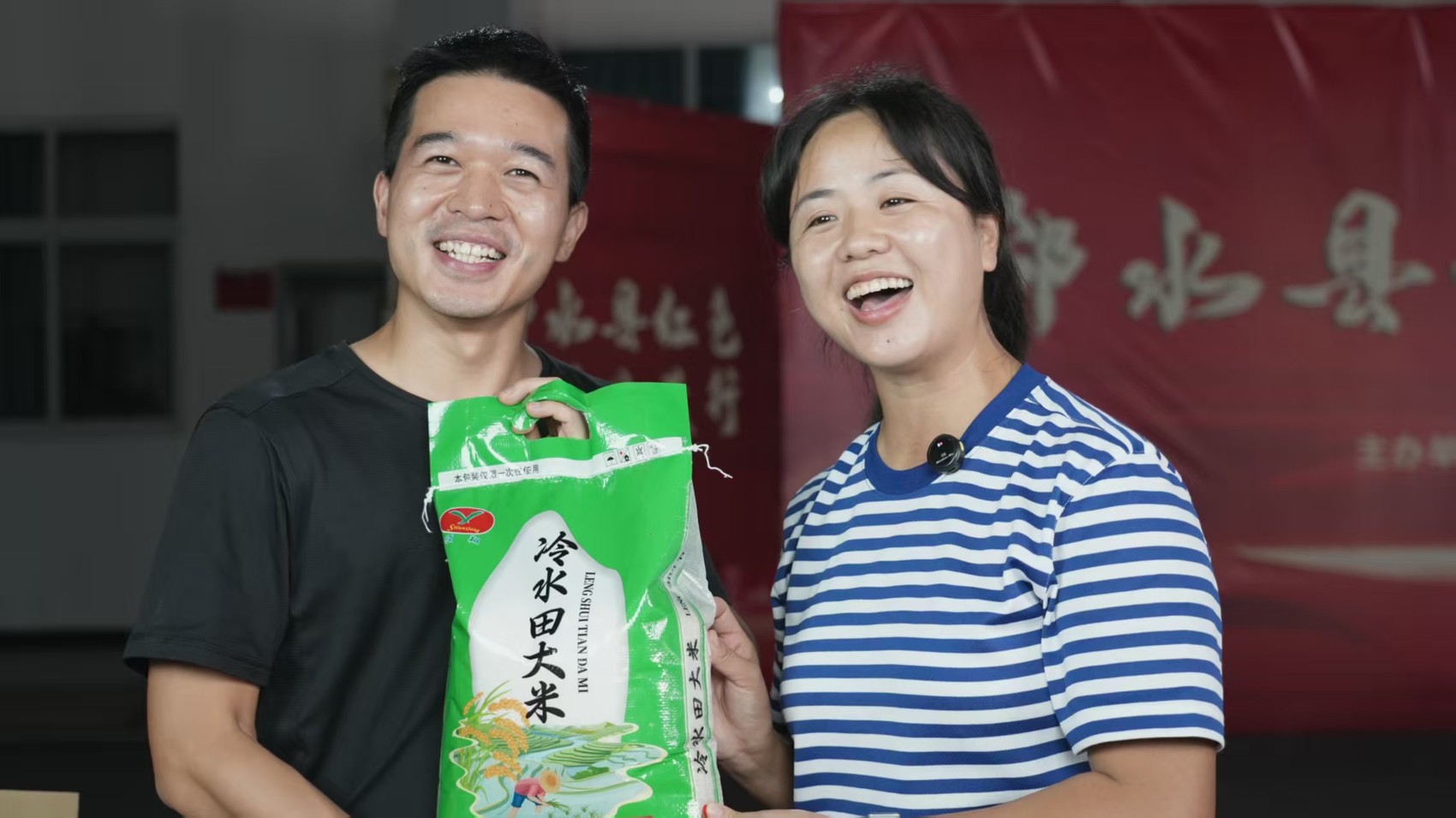 唐冰峰(左)与魏维(右)正在给直播间的观众介绍冷水田大米。(邓鹏 摄)