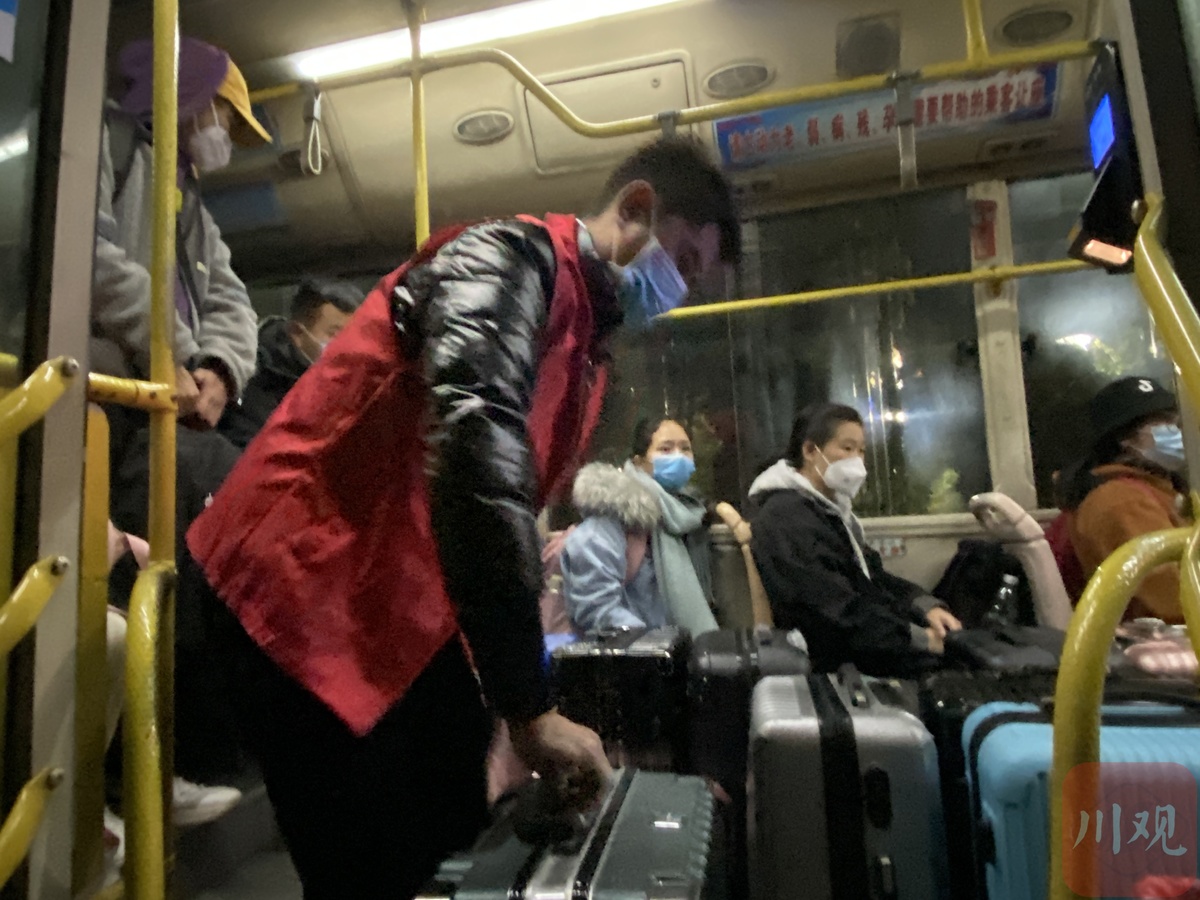 “大家带好口罩,排好队,前门上车,行李留在这里就行。”看见车开过来,攀枝花市公交公司第五分公司安运科的工作人员贺艳琳向排队的学生们连声叮嘱。