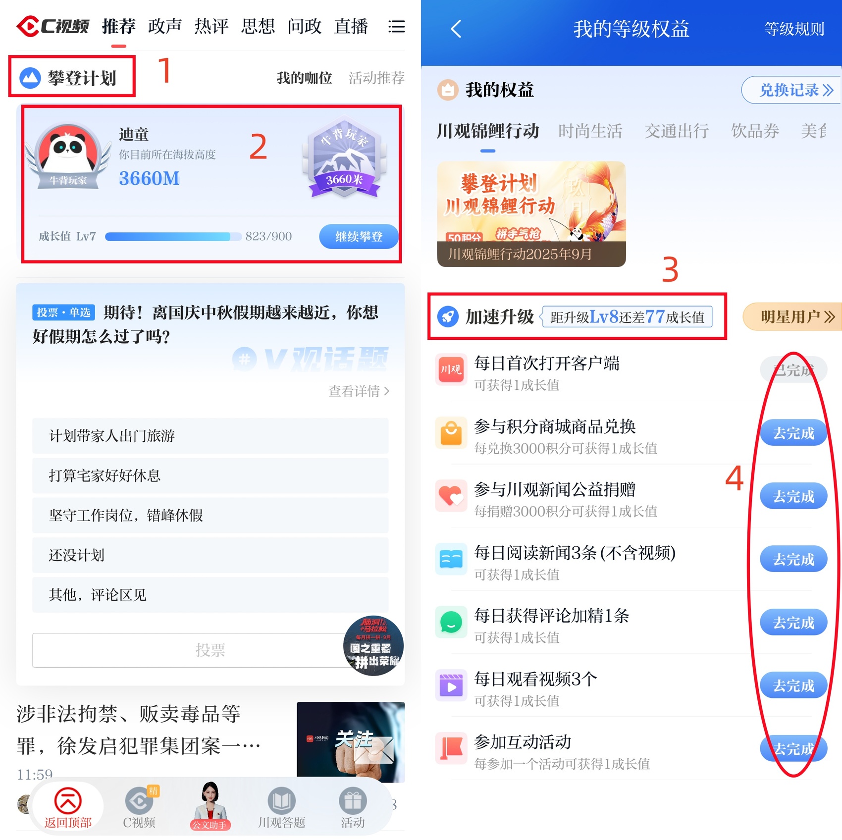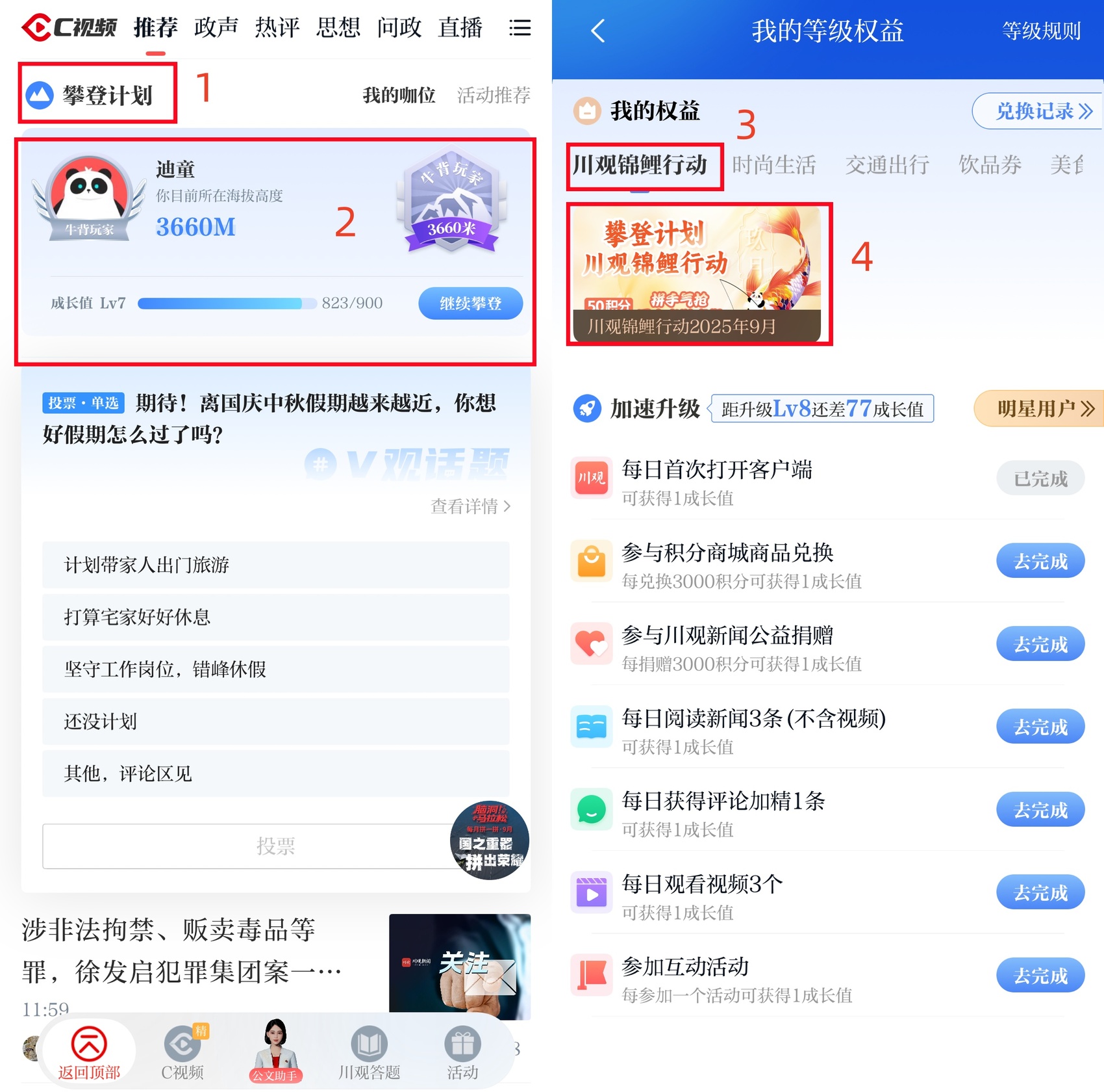 2、在川观新闻首页,点击“攀登计划”—“我的权益”,找到“川观锦鲤行动2025年9月”活动图片,根据提示参与抽奖。