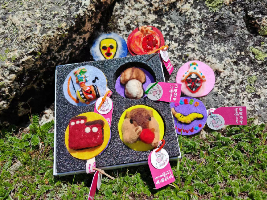 “华藏”平台首批上架的产品,将巴塘四季浓缩成迷你的掌心好物。样式主要包含以土拨鼠、藏戏脸谱等元素制成的冰箱贴,用“甲卓”小麦、格桑花等形象做成的胸针,以及围绕当地红毡房和苹果等为原型设计的毛毡扩香器等。