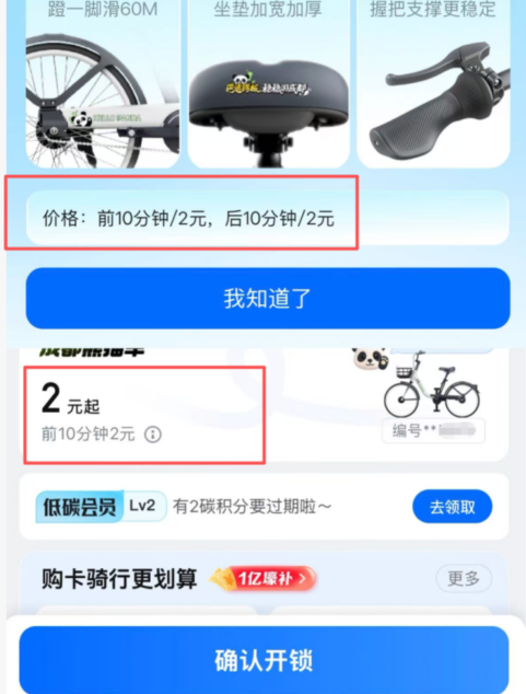对于这种定制高级版的单车,在开锁页面需要明确标注价格,按需使用。不过这个哈啰熊猫单车骑起来确实挺拉风的,语音提示也很有趣。