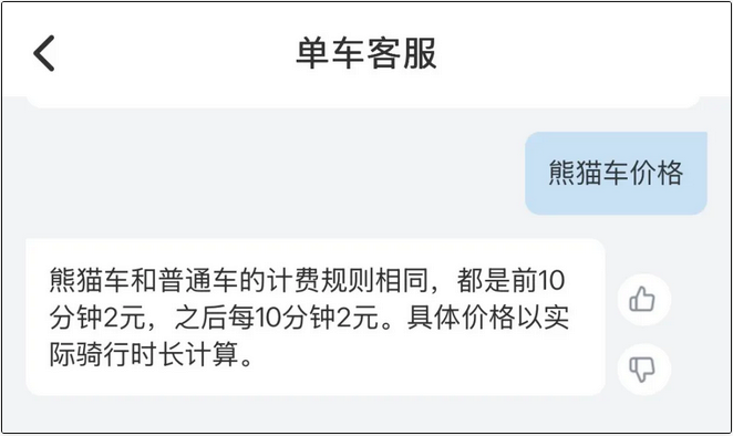 为此,记者随后联系了哈啰客服,其在回复中表示:“熊猫车和普通车的计费规则相同,后续都是每10分钟2元。”显然,这一回答与实际的计费规则相互矛盾。