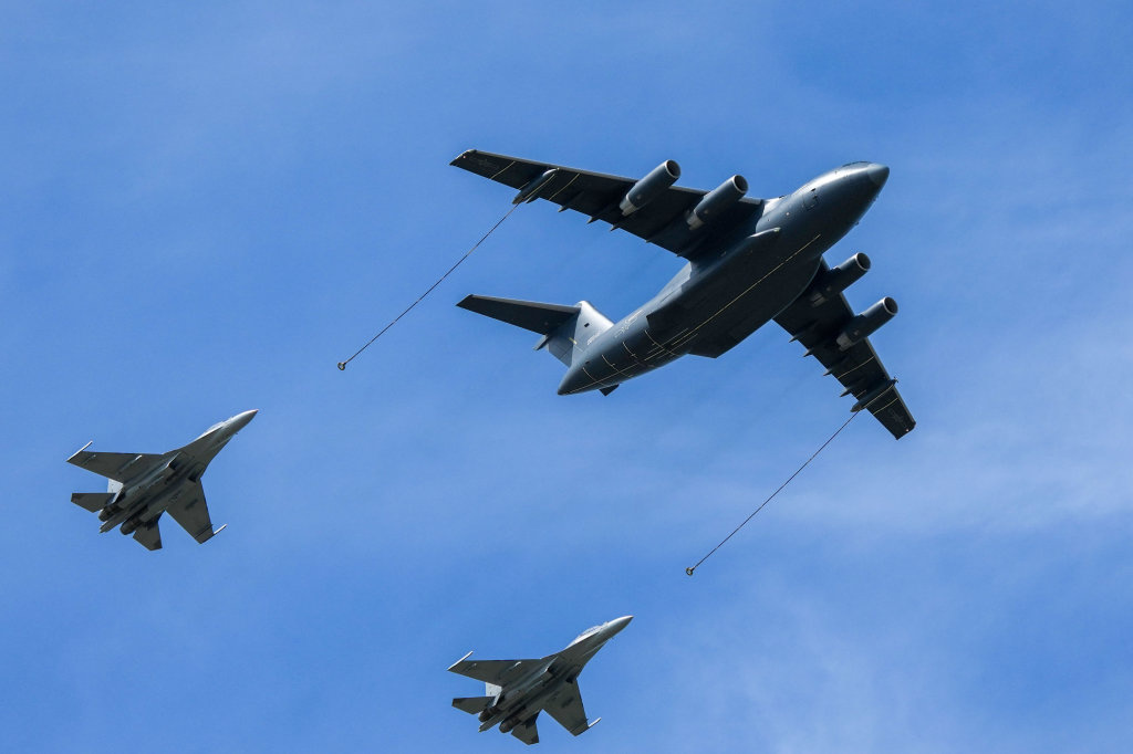 9月19日,运油-20A和歼-16编队通场。新华社记者 颜麟蕴 摄