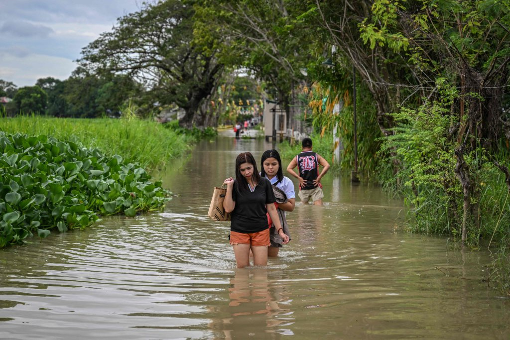 9月17日,在菲律宾布拉干省,人们涉水前行。
