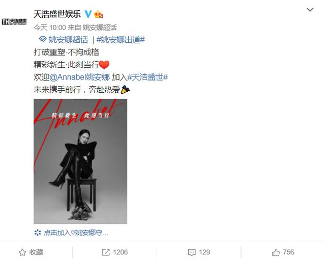 当时就有不少网友猜测姚安娜是否会参加目前如日中天火爆的女团选秀,如果是真的话,恐怕会被各大卫视和网娱平台抢破头。果不其然,2021年1月14日,姚安娜微博信息认证为“天浩盛世签约艺人”,并分享了黑白时尚大片,配文“新开始”,正式宣布出道。据红星新闻报道,任正非曾经亲自前往经纪公司视察对姚安娜的推广计划。较之网友们关心姚安娜会不会代言华为手机,金妹儿更关心能够签下华为小公主的娱乐公司——天浩盛世。