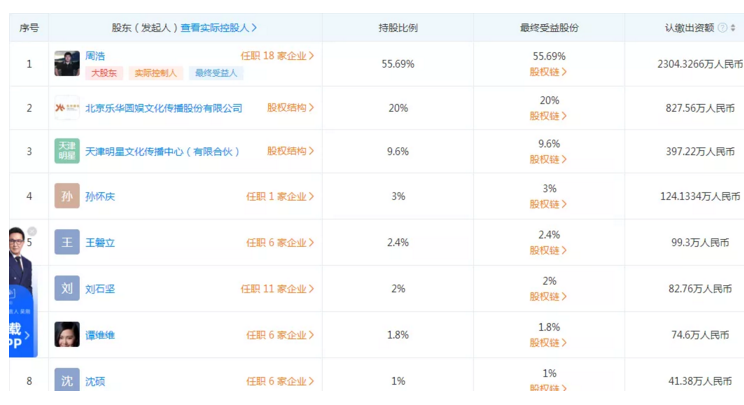 第二大股东是北京乐圆娱乐文化传播有限公司(乐华娱乐)占股20%。乐华娱乐被称为内娱偶像第一经济公司,老板是杜华,造星能力屈指一数。