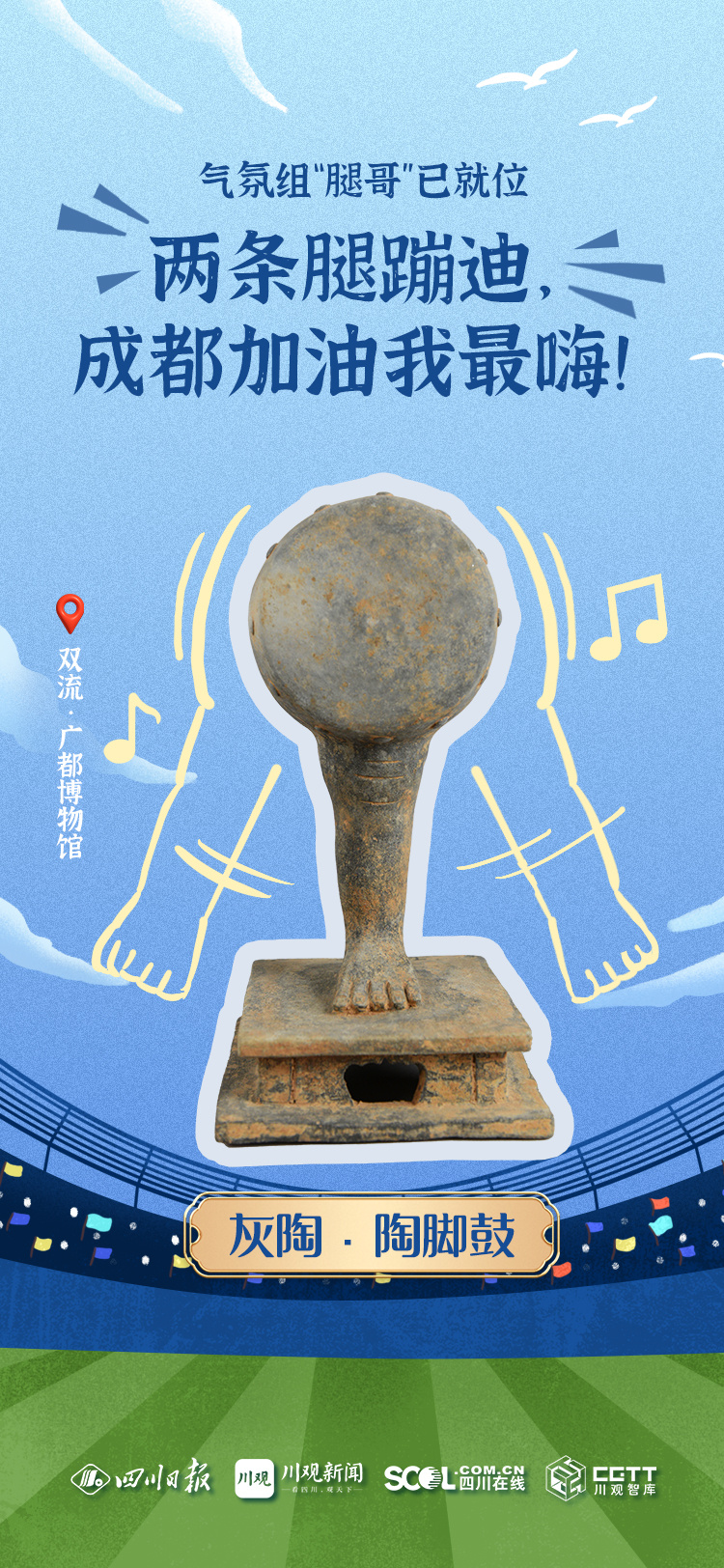 同样来自双流广都博物馆的陶脚鼓,虽然只剩腿,但一点都不妨碍它成为全场最嗨气氛王!听说首战在双流,连夜蹦着迪来加油,网友急喊:“腿哥冷静!你这腿真要跑起来,保安都追不上!”