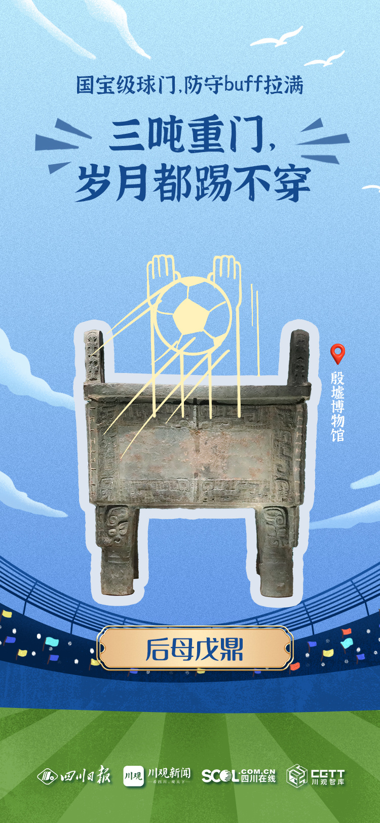 成都主场还有“外援”文物——从殷墟博物馆来双流出差的后母戊鼎(仿制品),当起了“国宝级球门”!别人球门靠网拦球,它靠三千年的厚重历史镇场,往那一站就自带“防守buff”,仿佛在说:“岁月都踢不穿,你想进球?先问问我这千年底蕴答不答应!”