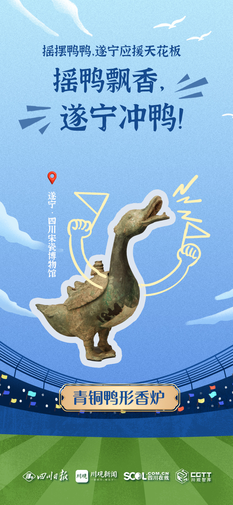 首战出征的遂宁队,派出“文物死忠鸭”!青铜鸭形香炉彻底放飞自我,一边飘香一边蹦迪,从博物馆摇头晃脑直奔赛场:“遂宁队!冲鸭!”