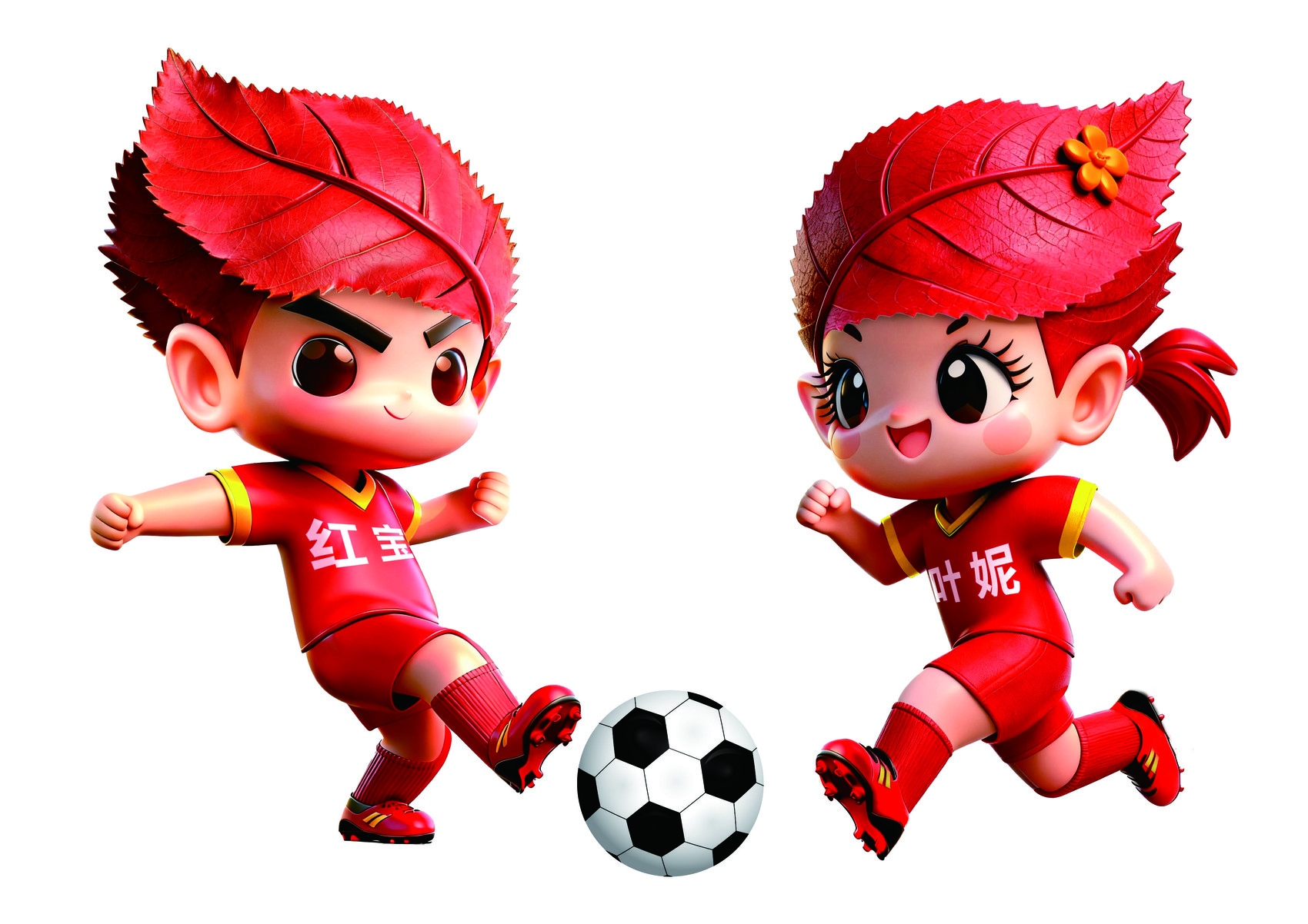 吉祥物红宝(男)、叶妮(女)以巴中光雾山红叶为灵感设计,将巴中自然之美与人文拼搏精神完美结合。火红的叶片化作红宝和叶妮活泼灵动的发型,两人身着巴中红的足球服,在赛场上团结协作、激情奔跑、勇往直前,充满朝气与活力,犹如巴中红叶般炽热夺目,展现出巴中人民热情奔放、拼搏奋进、精诚团结的精神气,象征巴中奔向火热的希望和未来。