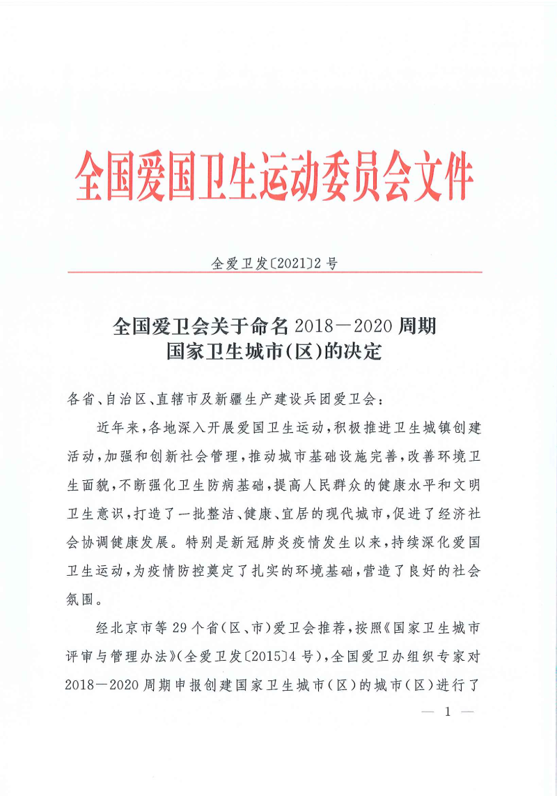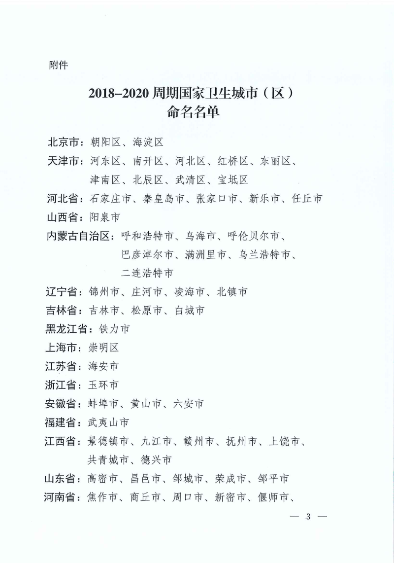 全国爱卫会关于命名2018-2020周期国家卫生城市(区)的决定
